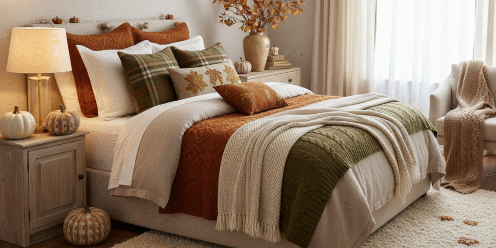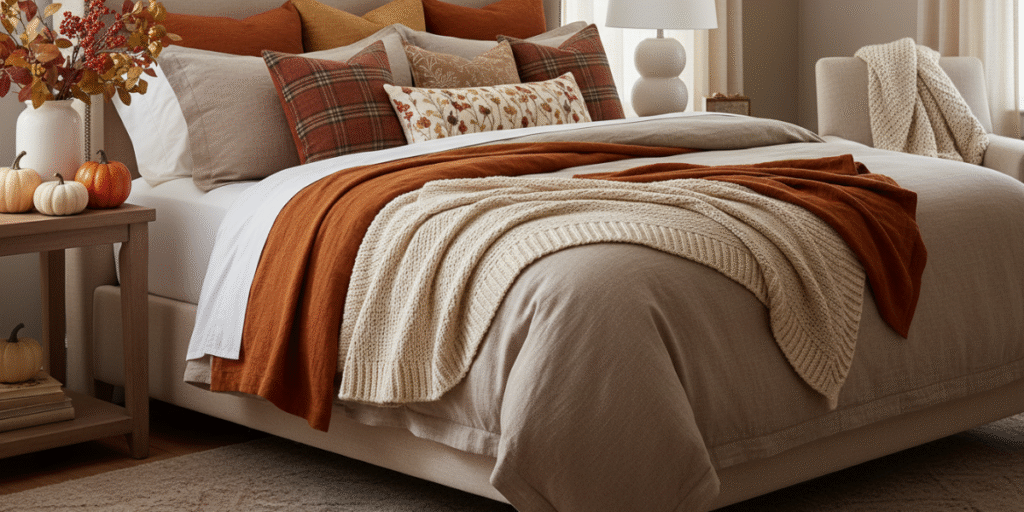Bedrooms feel inviting with textured blankets for fall, fall throw pillows, and neutral fall tones. Warm fall tones and subtle autumn colors enhance the cozy fall home vibe.