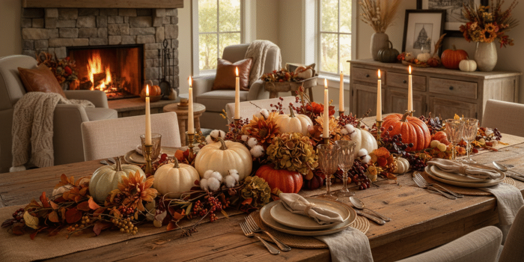 Tablescapes come alive with pumpkins décor and fall stems and faux florals layered with candles. Fall candle scents and warm fall tones create a cozy fall atmosphere that is perfect for autumn dinners.