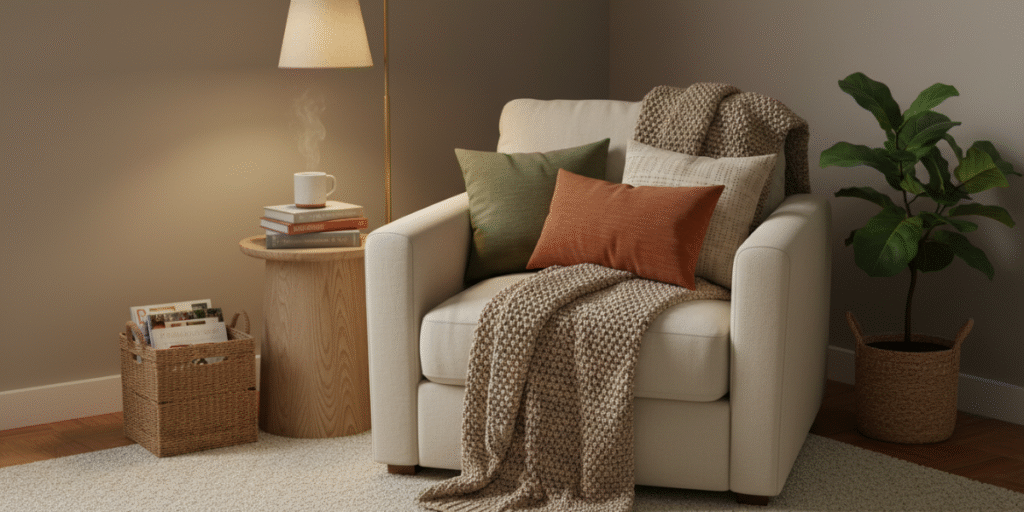Lighting controls ambiance, especially when working with subtle colors. Try layering a wireless wall sconce, floor lamp for corner lighting, or table lamp for softness. When combined with natural tones and soft lighting ideas, the corner glows with warmth rather than harsh glare. This tonal harmony creates an inviting feeling and complements most home styling preferences nationwide.