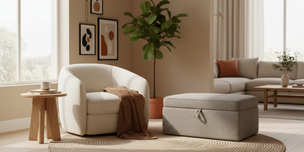 Furniture transforms overlooked corners into magnetic zones of comfort. A simple accent chair or cozy chair corner can create a quiet retreat, especially when paired with a round accent table and warm textures. Many decorators prefer multifunctional furniture because it adds usefulness without cramping the room. Modern homeowners often rely on corner furniture ideas for small spaces that blend compact frames with soft tones for visual ease. These subtle choices help turn stale corners into destinations that shape how guests read the room.