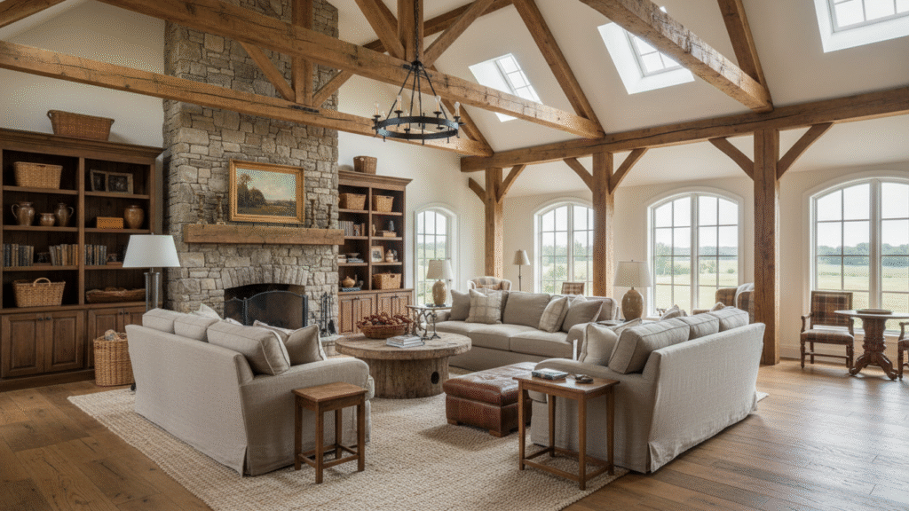Certain features anchor Farmhouse Style Interior Design. Architectural details like Wood ceiling beams, wide plank floors, and Stone fireplace elements create structure. These details feel permanent, grounding spaces with visual weight and historical depth.