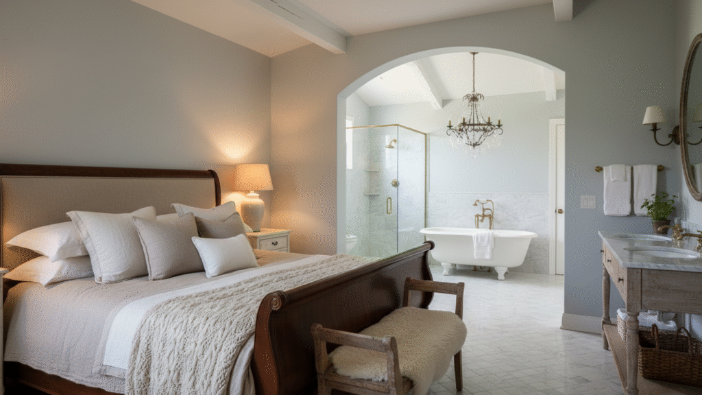 Bedrooms emphasize rest and softness. French country bedroom decor often includes a Sleigh bed French style, French farmhouse bedding, and Neutral bedroom design choices. Built-in bookcases bedroom storage keeps clutter invisible and calm.