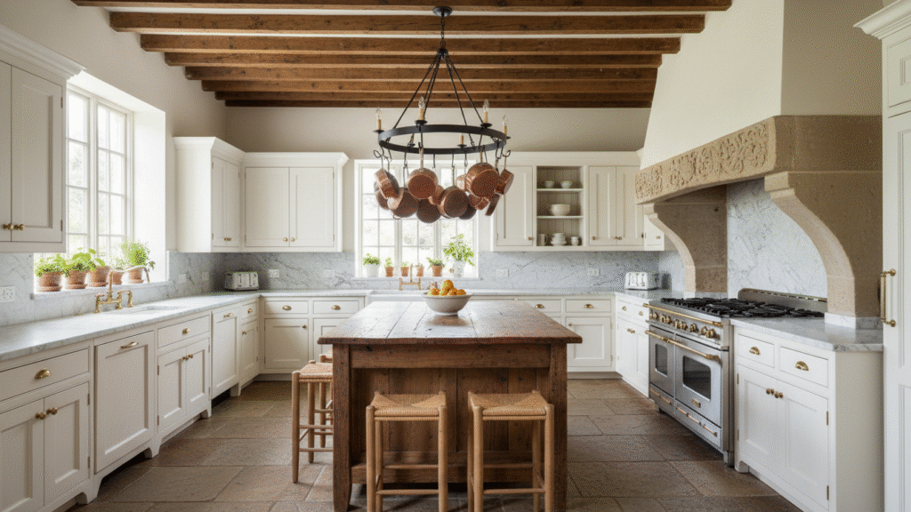 In many American homes, the kitchen defines Farmhouse Style Interior Design. A French country farmhouse kitchen often features White farmhouse kitchen cabinets, a Marble backsplash kitchen, and a bold Stone range hood. Wood beam kitchen ceiling details add depth overhead.