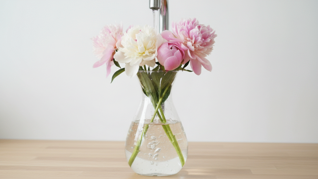 Remove any leaves that would dip below the waterline — trust me, nobody wants mushy leaves floating in their vase. Some people swear by the warm water trick to help stubborn peony buds open faster. I tried it once with some tight Trader Joe’s peonies — dunked the lower stems in warm water for 10 seconds, and just like that… the buds slowly began to unfurl. Totally satisfying.