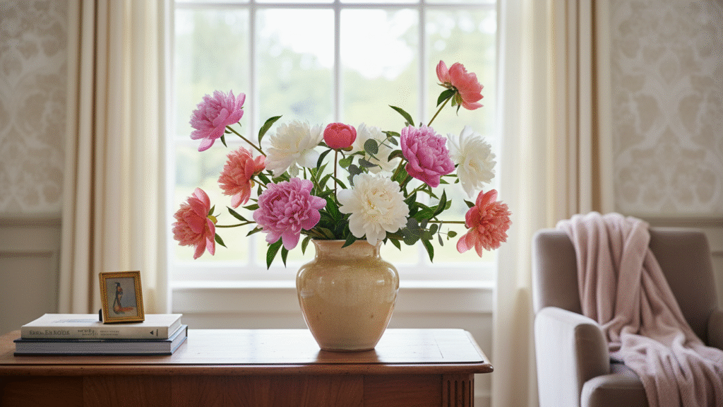 The right vase arrangement matters as much as the flowers themselves. I like medium-height vases with wide mouths — the blooms have room to breathe. Too cramped, and the peony petals smush together; too shallow, and the stems flop.