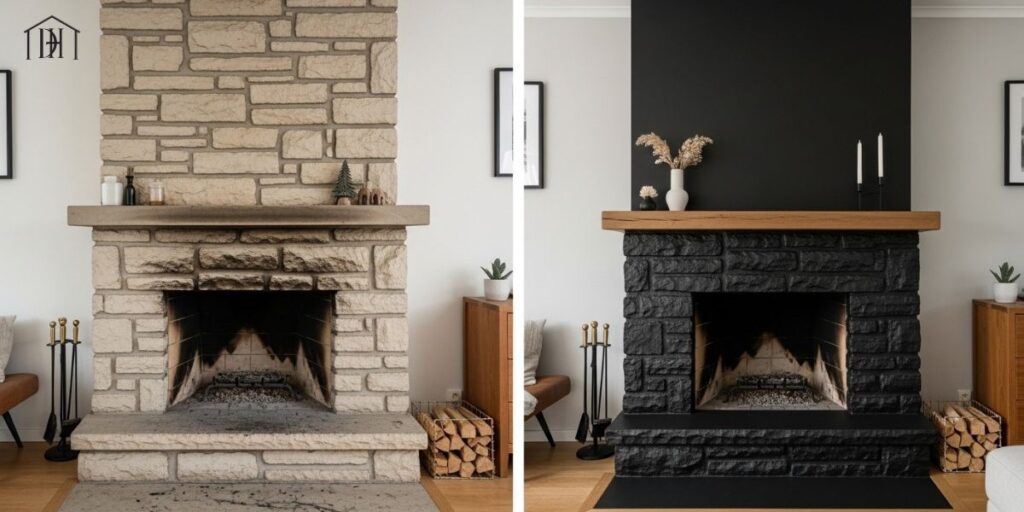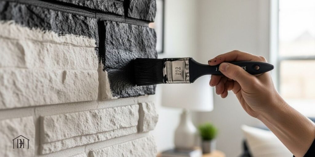 Selecting the right paint makes or breaks this DIY fireplace project. Most pros use interior latex paint for smooth stones or masonry paint for rough textures. Popular colors include Sherwin Williams Tricorn Black for bold contrast or Sherwin Williams Iron Ore for a softer charcoal finish.