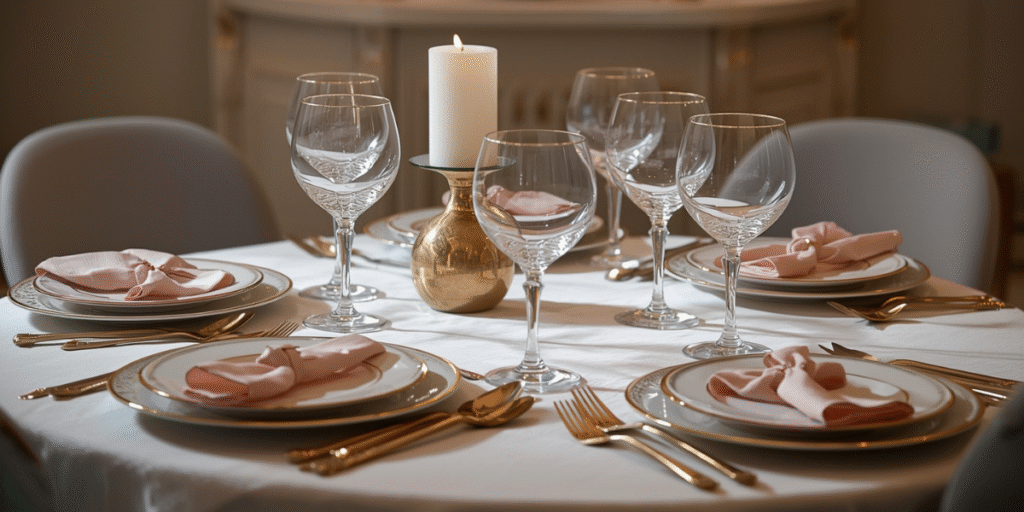 Start with the foundation — the cloth. Then layer napkins, plates, and silverware. Don’t stress over rules; just keep it balanced. I usually polish wine glasses last, right before dinner. That little sparkle makes everything look pulled together.