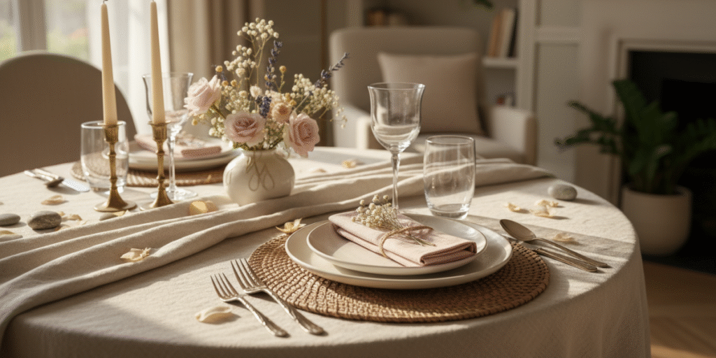 Colors set the mood before words do. Think blush, cream, muted rose, and gold. Pottery Barn stylists swear by layering tones instead of matching everything. Those small variations create depth — the kind that feels natural, not forced.